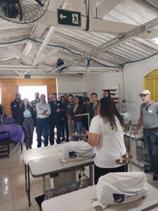 Logo no início das atividades, foi realizada uma visita pela área da Associação, que além de uma horta comunitária, agrofloresta, quadra de futebol, salão de reuniões, conta com um galpão onde são realizadas aulas de corte e costura para a comunidade interessada.